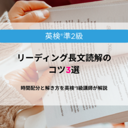 2025年1月15日 / 最終更新日時 : 2025年12月31日 在宅英語 準2級英検®準2級リーディング長文読解のコツ3選!時間配分と解き方を英検®1級講師が解説 英検®準2級リーディングのコツ3選!2024年新形式対応の時間配分や長文の解き方をプロ講師が伝授します。言い換えや消去法をマスターして高得点合格を目指しましょう!