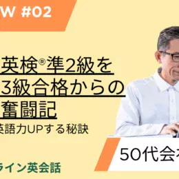 2025年4月28日 / 最終更新日時 : 2025年7月19日 在宅英語 準2級社会人が英検®準2級を目指す!3級合格からのリアルな奮闘記 Sさんの英検® 3級合格体験談&準2級奮闘記 2024年度第3回英検®で見事3級に合格し、準2級の合格も目指す50代会社員のSさん。英語力ゼロからどのようにしてこの成果を達成したレッスン内容や宿題、自宅学習のポイ […]