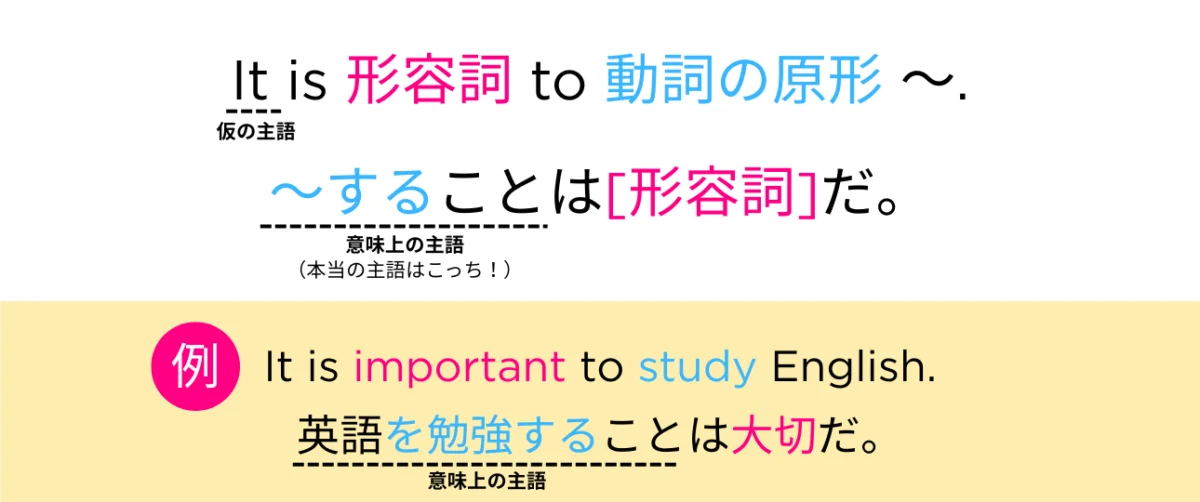 仮の主語Itを用い、説明したり状態を表したりするときに使う構文。意味上の主語である不定詞は後ろに置く。「(それは)~だ、です。」などと訳される。
