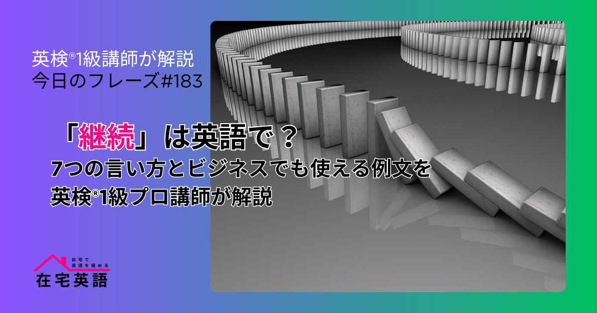 | 【こちらの記事も読まれています】 👉「継続」は英語で?7つの言い方とビジネスでも使える例文を英検®1級プロ講師が解説【今日のフレーズ#183】 |