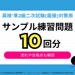 2025年9月20日 / 最終更新日時 : 2025年10月7日 在宅英語 準2級英検®準2級二次試験(面接)対策用サンプル練習問題10回分!流れや合格点も解説 英検®準2級の二次試験(面接)対策に使えるオリジナル練習問題を10回分公開しています。自宅学習や塾、英会話スクールでご利用いただけます。試験の流れや合格点も解説しています。