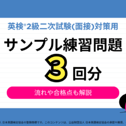2025年10月7日 / 最終更新日時 : 2025年10月7日 在宅英語 2級英検®2級二次試験(面接)対策用サンプル練習問題3回分!流れや合格点も解説 英検®2級の二次試験(面接)対策に使えるオリジナル練習問題を3回分公開しています。自宅学習や塾、英会話スクールでご利用いただけます。試験の流れや合格点も解説しています。